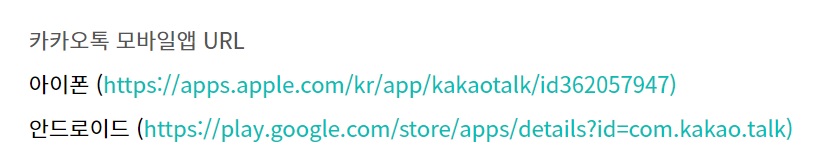 [ 카카오톡 모바일앱 URL ] 아이폰 ( https://apps.apple.com/kr/app/kakaotalk/id362057947 ) 안드로이드 ( https://play.google.com/store/apps/details?id=com.kakao.talk ) |