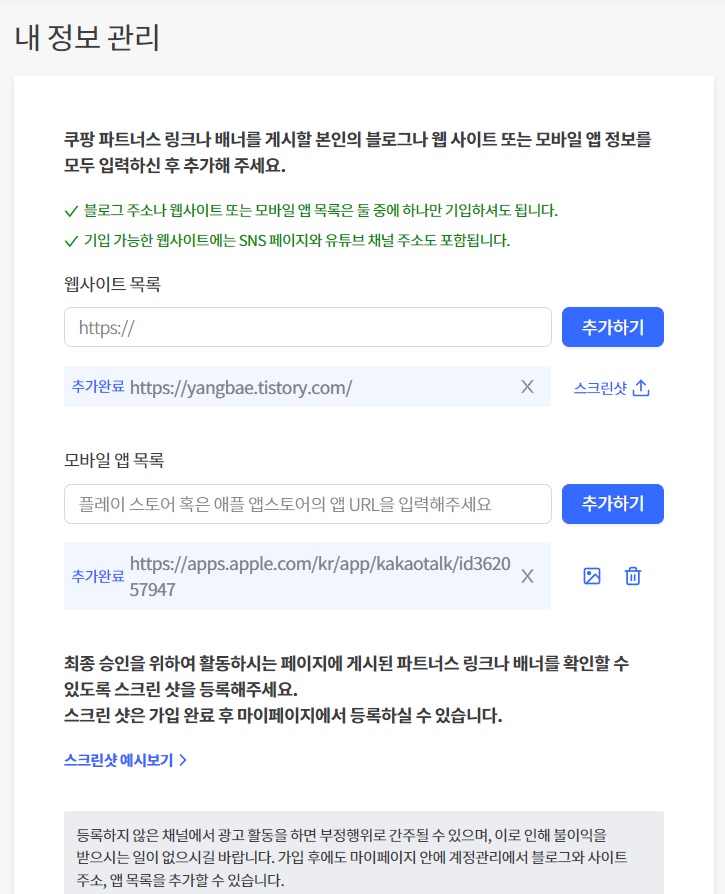 ▼ 쿠팡 파트너스로 활동할 블로그와 모바일 앱을 등록했습니다.